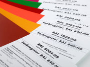 Das Farbregister RAL 840-HR beinhaltet alle 213 RAL CLASSIC Farben in semi matt. Die Karten sind verbindliche Farbvorlagen für Farbnachstellungen und Qualitätskontrolle und beinhalten XYZ-Werte, die Angabe des Abstands zum Urmuster und die Remissionskurve.
